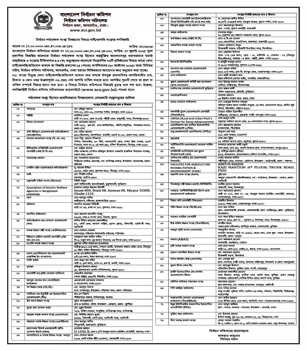 গণবিজ্ঞপ্তিতে বলা হয়েছে, বাংলাদেশ নির্বাচন কমিশনের ২৭ জুলাই ২০২৫ তারিখে প্রকাশিত বিজ্ঞপ্তির আলোকে নির্বাচন পর্যবেক্ষক সংস্থা হিসেবে অন্তর্ভুক্তির আবেদনগুলো যথাযথভাবে যাচাই বাছাইঅন্তে এ সংক্রান্ত নীতিমালার ৪.৪ (ক) অনুচ্ছেদের আলোকে নিম্নেবর্ণিত ৭৩টি প্রতিষ্ঠানের বিষয়ে কারো কোনো দাবি/আপত্তি/অভিযোগ থাকলে তা বিজ্ঞপ্তি প্রকাশের ১৫ কার্যদিবসের (২০ অক্টোবর ২০২৫) মধ্যে সিনিয়র সচিব, নির্বাচন কমিশন সচিবালয়, আগারগাঁও, ঢাকা বরাবর লিখিতভাবে জানানোর জন্য অনুরোধ করা যাচ্ছে।