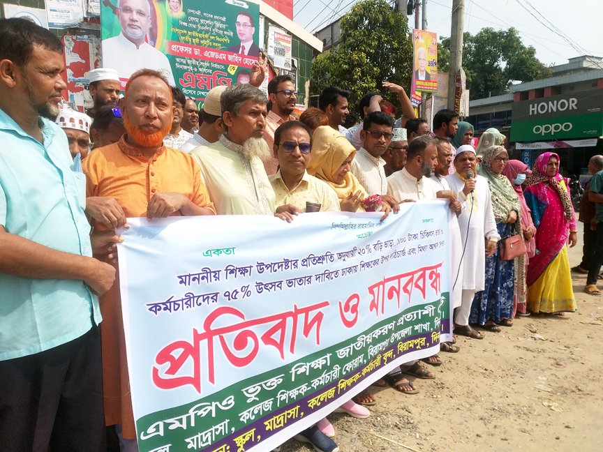মোঃ নজরুল ইসলাম (দিনাজপুর টোয়েন্টিফোর ডটকম) বিরামপুর উপজেলার বে-সরকারী শিক্ষকবৃন্দ বাড়ি ভাড়া, চিকিৎসা ভাতা ও উৎসব ভাতা বৃদ্ধির দাবি এবং ঢাকায় আন্দোলনরত শিক্ষকদের উপর লাঠিচার্জের প্রতিবাদে বুধবার (১৫ অক্টোবর) বিক্ষোভ মিছিল, মানববন্ধন ও প্রতিবাদ সভা করেছেন।