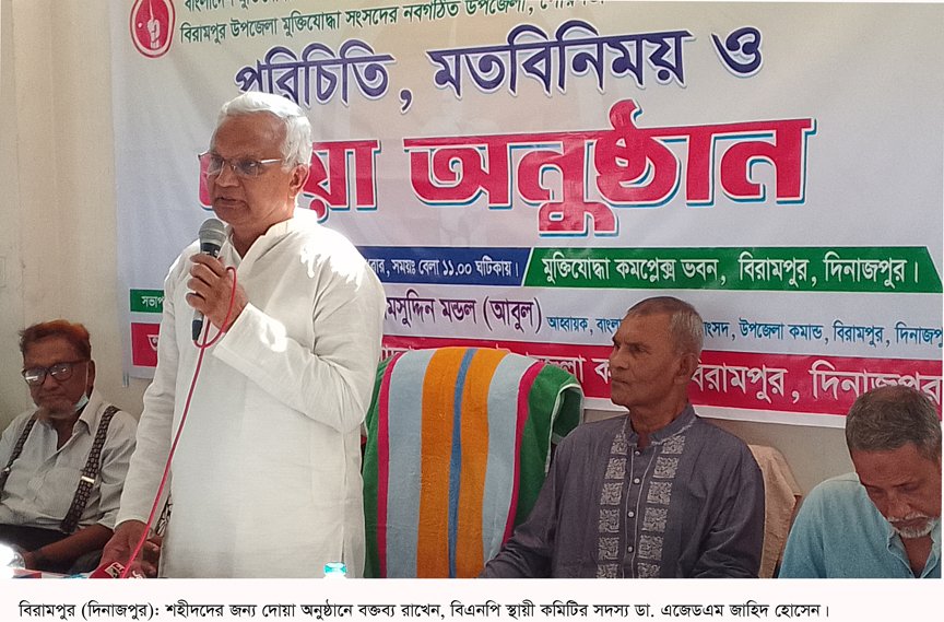 বিরামপুর উপজেলা মুক্তিযোদ্ধা কমপ্লেক্স ভবনের হলরুমে দোয়া মাহফিল পূর্ব মতবিনিময় সভায় উপজেলা মুক্তিযোদ্ধা কমা-ের আহবায়ক শামসুদ্দিন ম-ল আবুলের সভাপতিত্বে এবং সদস্য সচিব মোস্তাক হোসেন মাষ্টারের সঞ্চালনায় প্রধান অতিথি ছিলেন, বিএনপি’র স্থায়ী কমিটির সদস্য ডা. এজেডএম জাহিদ হোসেন। বিশেষ অতিথি ছিলেন, জেলা মুক্তিযোদ্ধা কমা-ের আহবায়ক মকছেদ আলী মঙ্গলীয়া, সদস্য সচিব সিদ্দিকুল হক বাচ্চু, সদস্য আনোয়ারুল ইসলাম, দিনাজপুর পৌরসভার সাবেক মেয়র শফিকুল হক ছুটু, বিরামপুরের মুক্তিযোদ্ধা সংগঠক অ্যাড. মওলা বক্স, উপাধ্যক্ষ একেএম শাহজাহান, উপজেলা মুক্তিযোদ্ধা কমা-ের যুগ্ম আহবায়ক ইছাহাক আলী, পৌর আহবায়ক আবু বক্কর সিদ্দীক, যুগ্ম আহবায়ক আবু হাসান মাষ্টার ও অন্যান্য মুক্তিযোদ্ধাবৃন্দ।