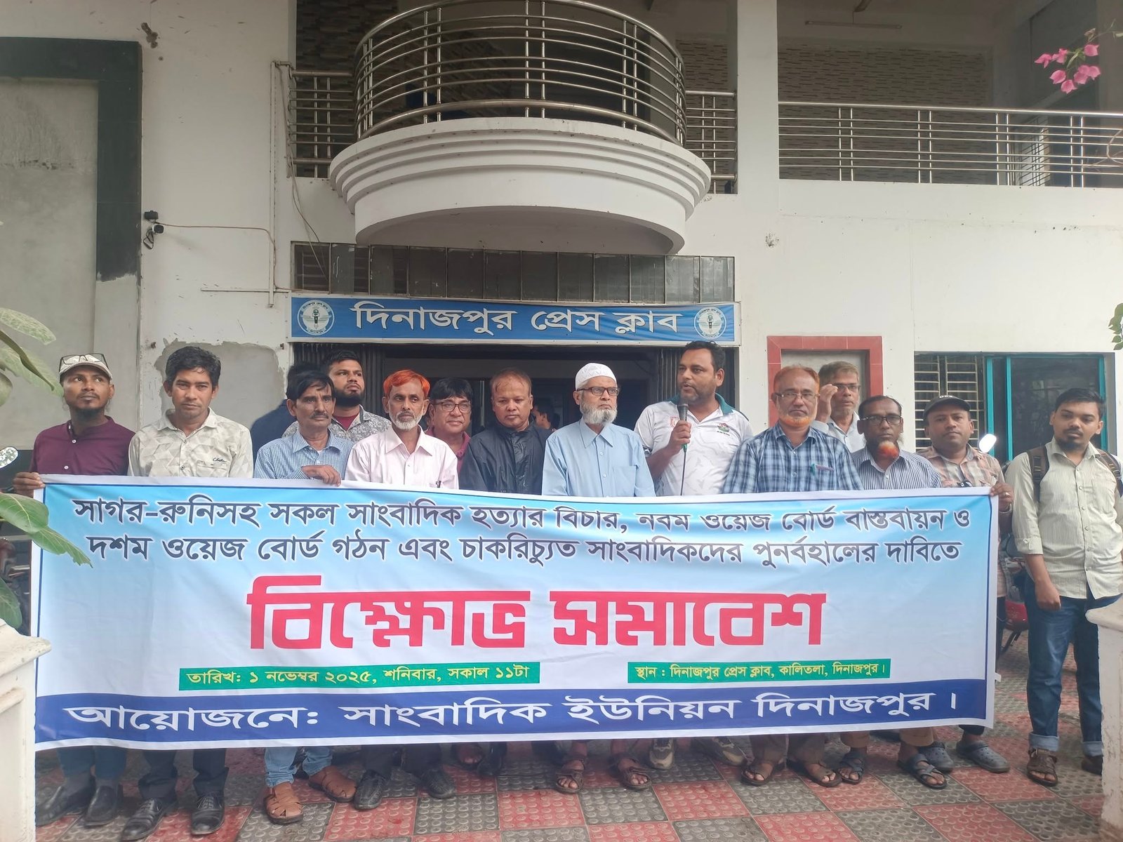 শনিবার (১ নভেম্বর ২০২৫) সকাল ১১ টায় দিনাজপুর প্রেসক্লাবের সামনে অনুষ্ঠিত সমাবেশে সভাপতিত্ব করেন সাংবাদিক ইউনিয়ন দিনাজপুরের সভাপতি অধ্যাপক সাদাকাত আলী খান।
