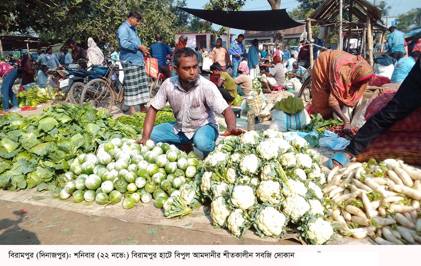 বিরামপুর উপজেলার কৃষি জমিতে ধান ও অন্যান্য ফসলের সাথে ব্যাপক আকারে শাক-সবজির চাষ হয়ে থাকে। স্থানীয় চাহিদা মিটিয়ে উৎপাদিত সবজি চালান হয় রাজধানীসহ দেশের বিভিন্ন এলাকায়। এবার উপজেলা কৃষি বিভাগ শীতকালীন সবজি চাষাবাদের জন্য ১হাজার ২৬৫ হেক্টর লক্ষ্যমাত্রা নির্ধারণ করেছে এবং ইতিমধ্যে ১ হাজার ৫৫ হেক্টর জমিতে চাষাবাদ সম্পন্ন হয়েছে। আগাম জাতের শীতকালীন শাক-সবজি ইতিমধ্যে বাজার দখল করেছে। গত কয়েকদিন আগে দাম বেশি থাকলেও শনিবার (২২ নভেম্বর) বিরামপুর হাটে সবজির দাম ক্রেতাদের নাগালের মধ্যে চলে এসেছে। এদিন হাটে ফুলকপি ৫০ টাকা, বাঁধা কপি ২০ টাকা, মুলা ১৫ টাকা, শীম ৮০ টাকা, বেগুন ৫০ টাকা, পটল ৪০ টাকা, কাঁচা মরিচ ৮০ টাকা, টমেটো ৮০ টাকা কেজি দরে এবং লাউ ৩০ টাকা পিচ হিসাবে বিক্রি হয়েছে। এছাড়া পুরাতন আলু ১৬-২০ টাকা কেজি দরে বিক্রি হয়েছে। সবজি দোকানী নিয়ামত আলী জানান, আগের চেয়ে বাজারে